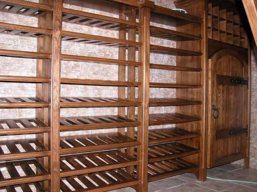 Устройство кладовки позволяющее максимально задействовать всю полезную площадь состоит в установке стеллажей занимающий всю высоту стены. Такие конструкции могут быть выполнены из дерева, их по силам сделать своими руками любому умельцу. Металлические стеллажи предлагаются специализированными точками продаж, по сравнению с деревянными у них есть ряд преимуществ: