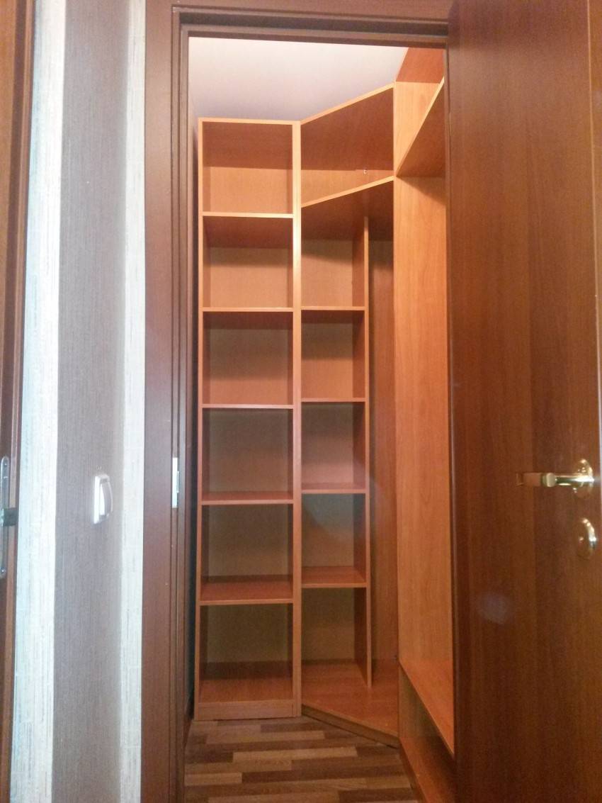 Системы хранения монтируются в угол. Вариант хорошо подходит, когда нужно сэкономить максимум места и материалов. Помещение образуют две стены комнаты и раздвижные двери или ширма.