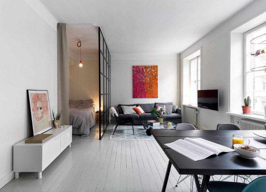 Интересные варианты зонирования несложно организовать, применив передвижные тонкие перегородки на колесиках.