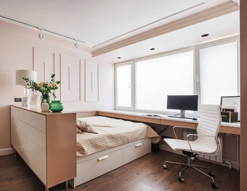 - Выделение целевой функции для каждой части спальни поможет разработать проект. Основная зона предназначена для ночного отдыха — сна. Оставшаяся площадь может быть использована, как кабинет, детская или гостиная.