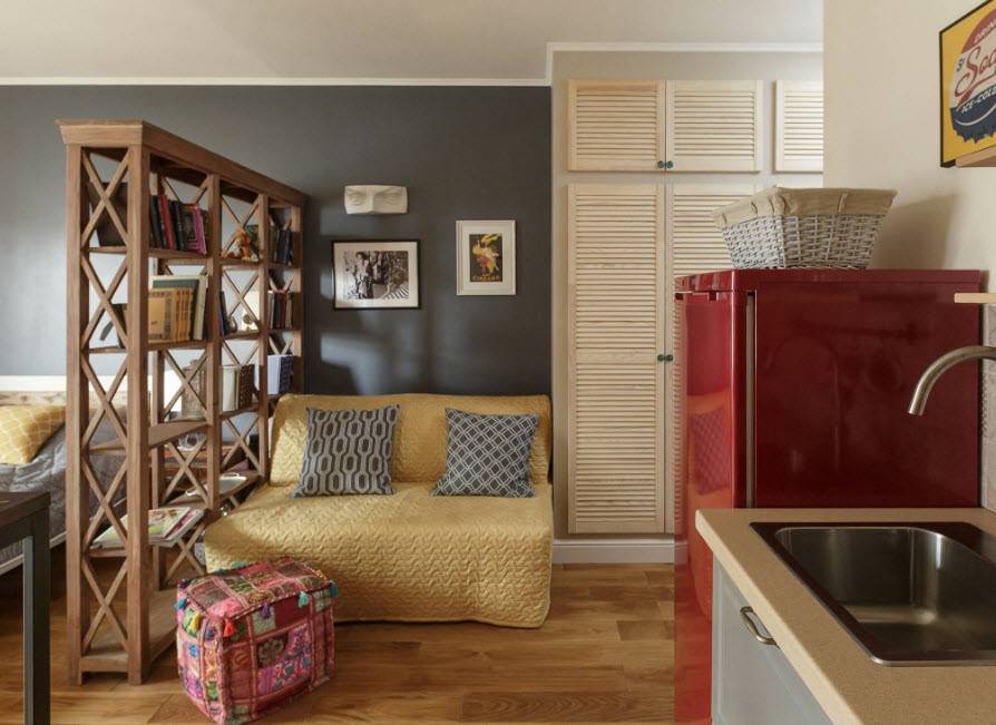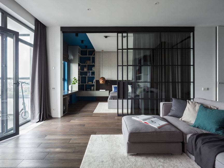 Зону сна проще всего будет отделить занавеской – ее легко убрать при необходимости. Стеклянные перегородки также придутся «в тему», диван с высокой спинкой, который поставлен почти посредине комнаты, также легко справится с задачей зонирования. Если разделение требуется чисто символическое, то в спальне или гостиной просто кладут ковер, закрывающий почти всю поверхность пола в выбранной зоне.