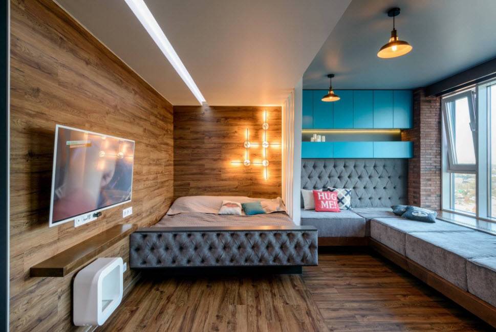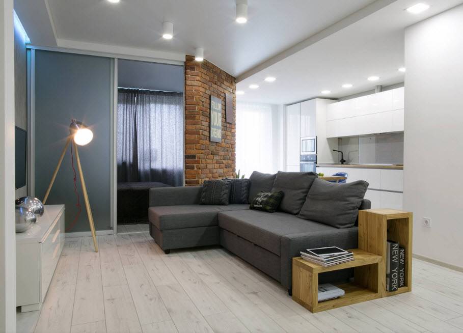 Зонирующие элементы тут предпочтительны не декоративные, а функциональные. Не желательно слишком загромождать такое пространство мебелью – передвижение по нему будет затруднительно. Спальная зона делается там, где ходят меньше всего – при наличии теплого балкона, лоджии, просторной ниши, ее разумно обустроить именно там. Разделение на зоны при помощи света будет наиболее удобным.