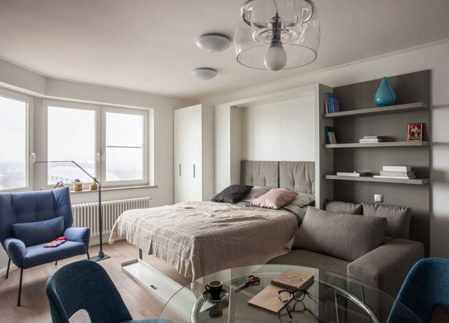 Вариант мебели-трансформера предполагает установку дивана вдоль корпусной конструкции, где в так называемом шкафу спрятана самая настоящая кровать. Легким движением руки гостиная превращается в спальню. При этом диван остается на своем месте, даже журнальный столик, находящийся в этой зоне не придется передвигать.