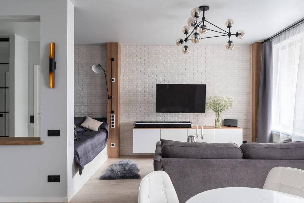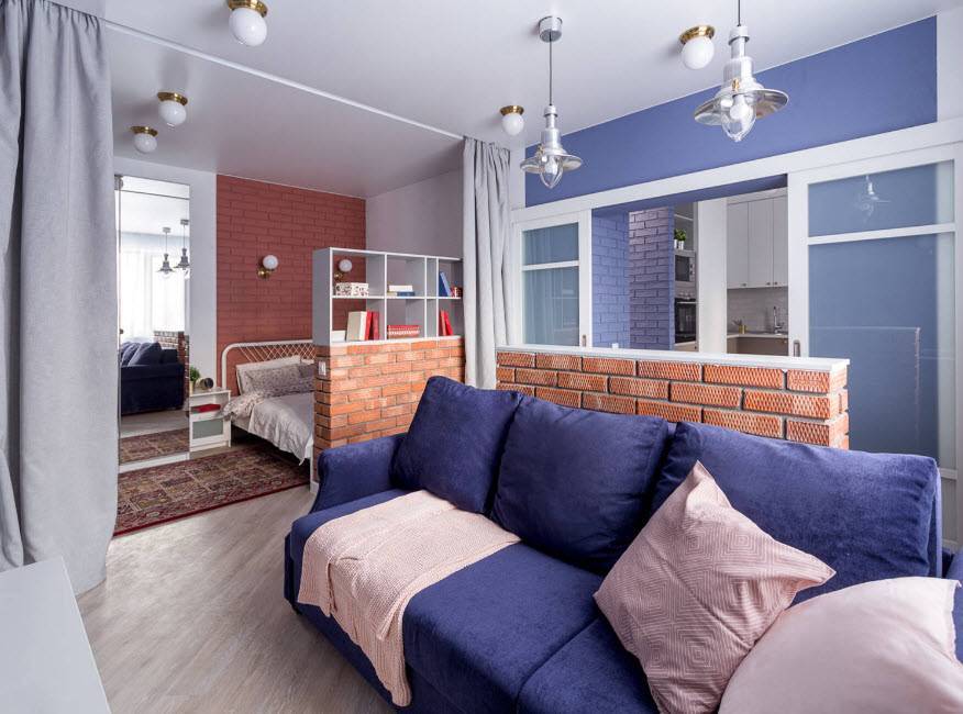 Перегородка для зонирования имеет огромное значение. Необходимо помнить, что если хочется классический вариант из кирпича, она будет занимать место, уже не передвинешь. Есть более мобильные перегородки из стекла, гипсокартона.