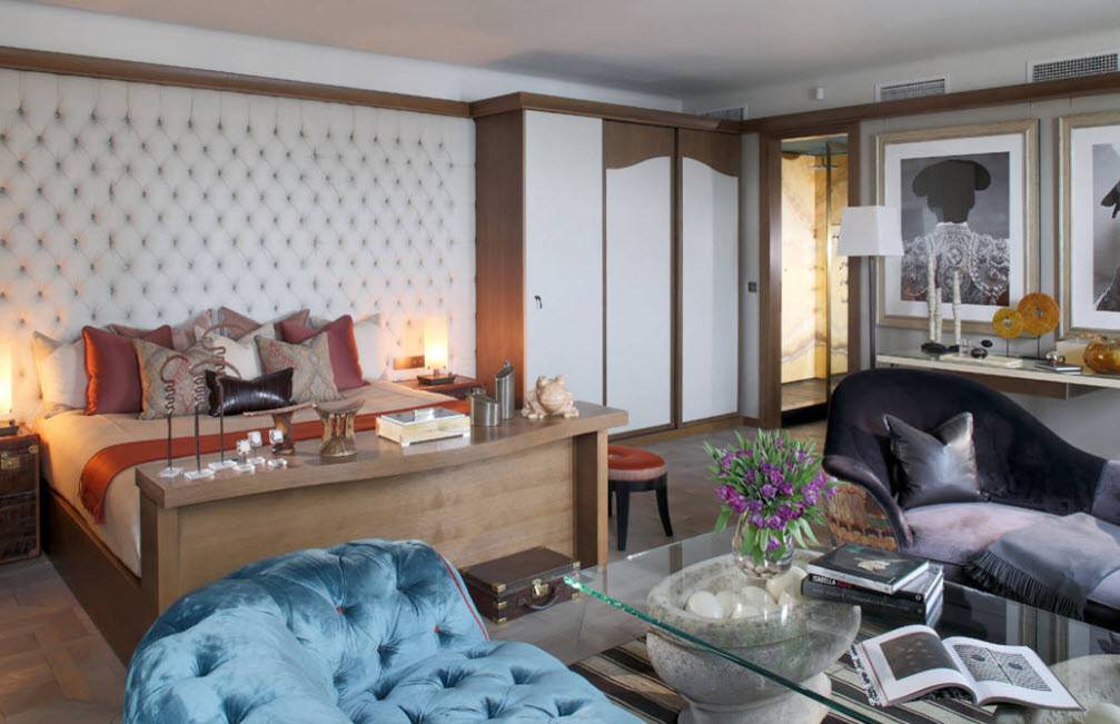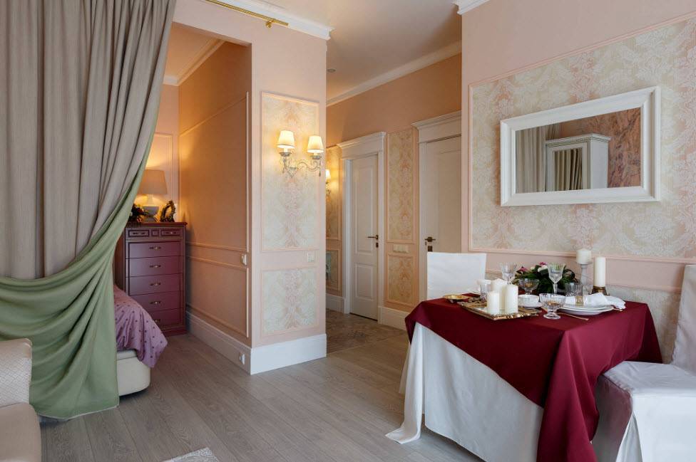 Отличной дизайнерской связкой для зон служит текстиль. Например, одинаковая обивка кресел и мягкого изголовья кровати, сочетающиеся оттенки штор и покрывала, орнамент на обоях и расцветка оконных гардин.