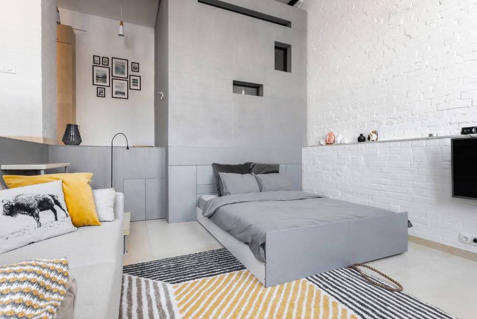 Спальню рекомендуется делать подальше от входа в объединенное помещение, чтобы это место было не проходным, тихим, уютным.