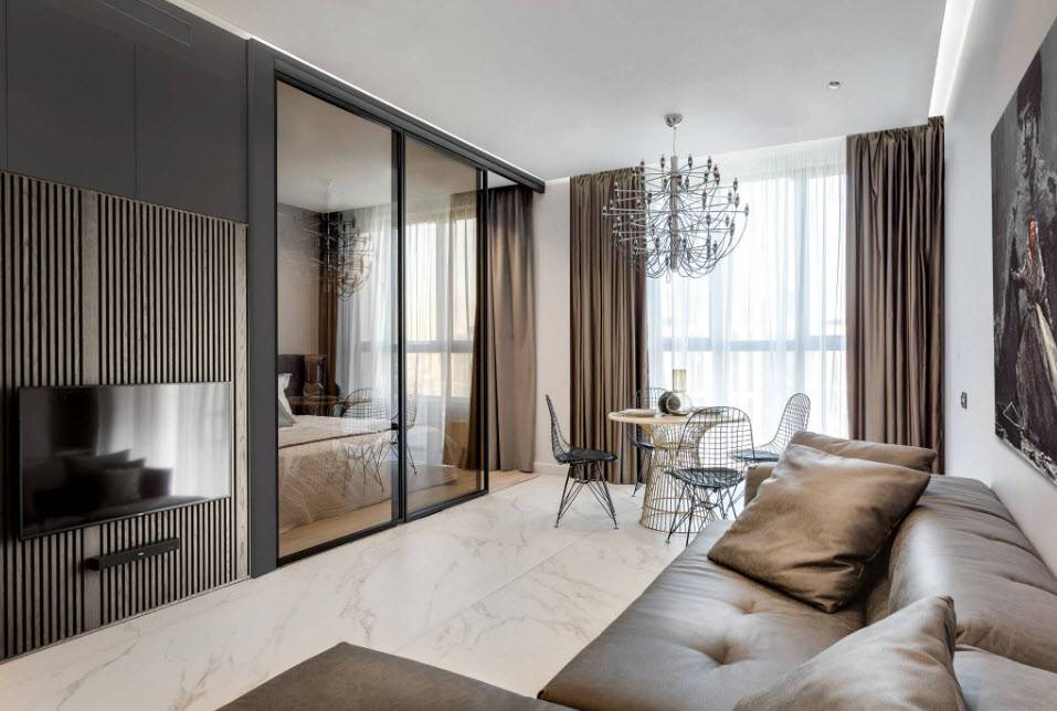Однокомнатное пространство, где вместе, в едином пространстве расположены зал и спальня, также будет уютным. Жилое пространство «однушки» редко превышает 16-18 метров, потому его хотя бы зрительно нужно расширить. Для этого используются глянцевые поверхности мебели, светлая окраска стен, зеркала, легкие разделительные элементы.