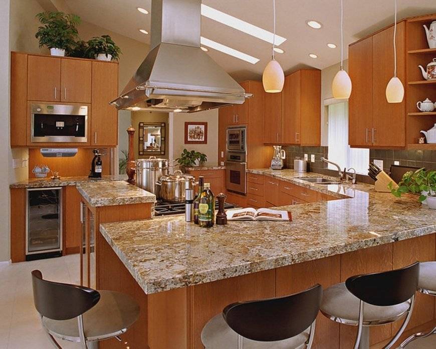 Источники света нужны и над барной стойкой: их цель заключается не только в освещении, но и в зонировании пространства кухни. Если кухня соединена с гостиной, то светильники должны находиться не только над обеденной группой из стола и стульев, но и рядом с зоной отдыха – креслами или диваном.