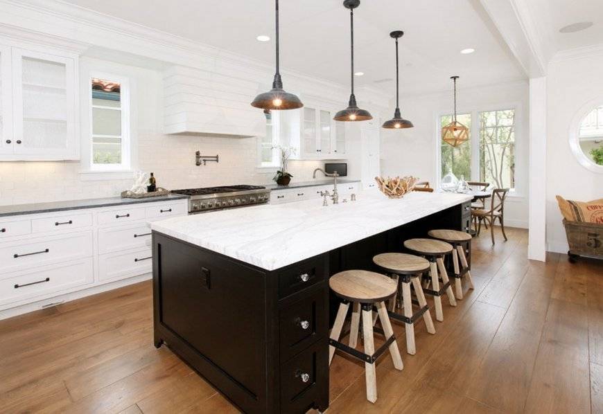 Над барной стойкой, островом, которые по совместительству исполняют роль рабочей зоны, удобно подсветить подвесным светильником с реостатом на высоте 70-85 см от поверхности. Возможность приглушить или, наоборот, добавить свет позволит вам и комфортно готовить, и совершать трапезу в приятной обстановке в любое время суток.