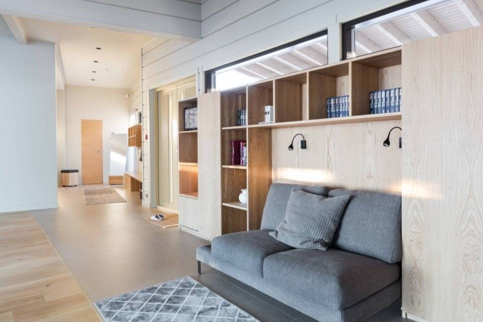 Оформляя стены, можно комбинировать разные цвета и материалы. Прекрасно смотрятся в просторных помещениях пробковые и деревянные панели, декоративная штукатурка. Для отделки пола обычно используется влагостойкий ламинат или керамика. Просторная прихожая позволяет с легкостью оборудовать гардеробную.