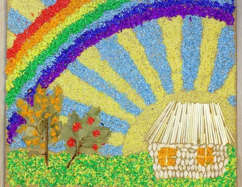 Хорошей идеей использования различных семян растений в рукоделии является поделка «Сказочной радуги». Для изготовления понадобятся различные сухие семена растений, пластилин, клей, стандартного формата лист плотной бумаги, различные крупы.