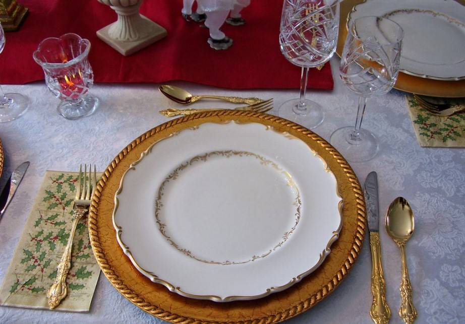 Один из непростых и четко регламентированных моментов сервировки стола для гостей к празднику – раскладка столовых приборов. От подставной или закусочной тарелки ножи и ложки кладут справа, вилка при этом обязательно должна оказаться с левой стороны. Все приборы лежат параллельно относительно друг друга, под углом в 90 градусов к краю стола. Расположение столовых приборов считается верным, когда их края оказываются на одной прямой с нижним краем тарелки.