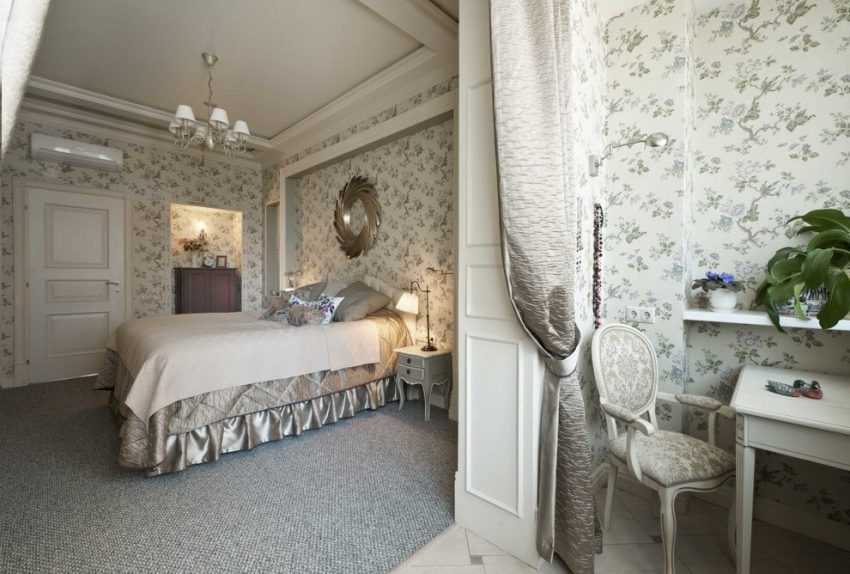 - для стилей кантри, прованс, некоторых направлений классики для стен спальни в хрущевке потребуются обои в цветочек, лучше в мелкий, или полотно с орнаментом в тон основе, при таком решении в отделке мебель должна быть простой и лаконичной, либо очень изящной, кованной или резного дерева белого или натурального медового оттенка.