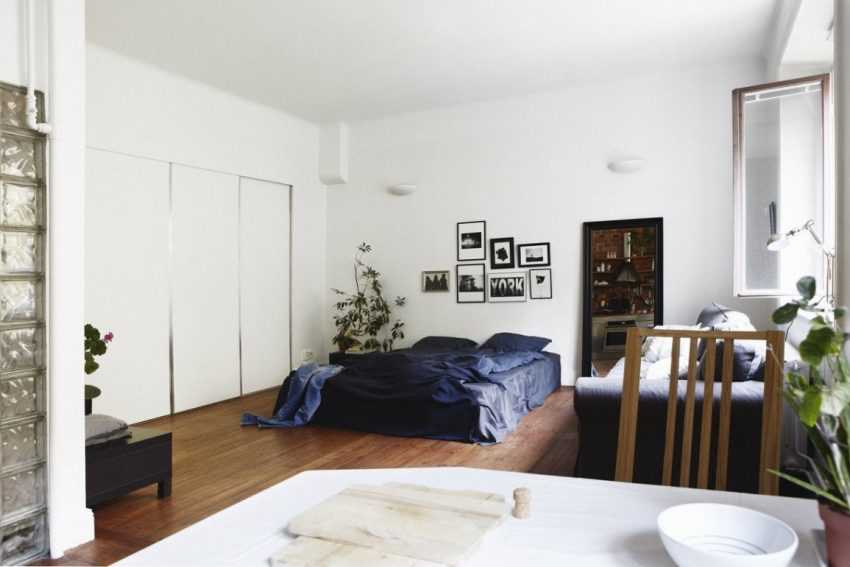В очень маленьком помещении стоит отказаться от классической модели кровати на каркасе. Отличный вариантом является заказ прочного матраса, только он не должен быть надувным. Матрас можно установить на напольный каркас, который отлично подходит для хранения вещей и разных мелочей. Вместо отдельной кровати можно использовать диван-кровать.