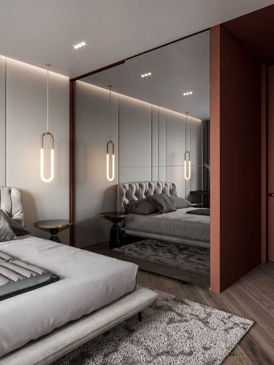 Интерьер спальни, фото-дизайн в хрущевке, вертикальная полоса на обоях и высокие пеналы с зеркалами зрительно меняют геометрию пространства
