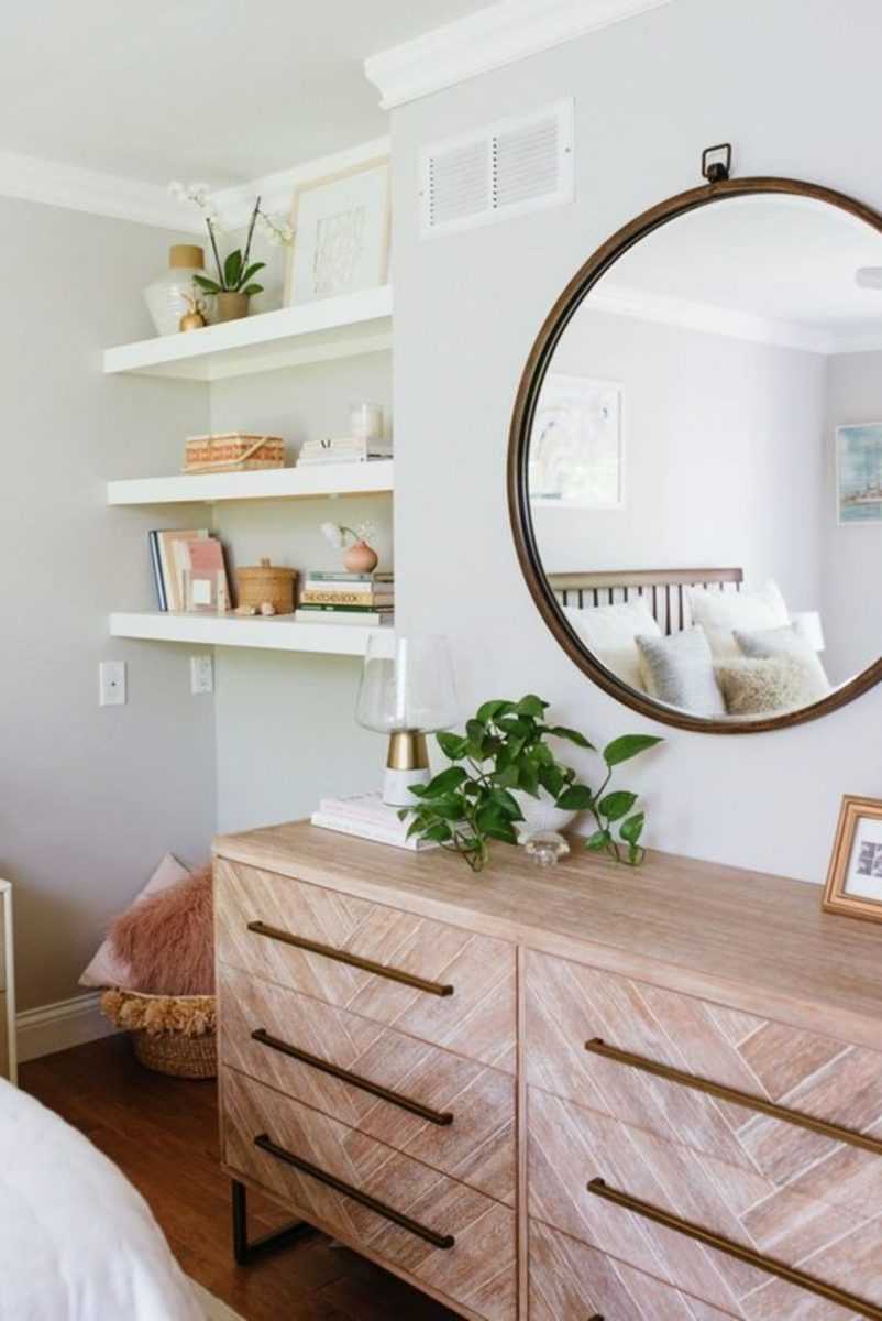 Зеркальные поверхности визуально раздвигают помещение. Однако слишком злоупотреблять использованием отражающих декоров и зеркал в малогабаритной спальне не стоит. Это не только не улучшит ее дизайн, в скорее превратит помещение в зазеркалье. Одного зеркала на дверце шкафа или в составе трюмо с подсветкой хватит здесь с избытком. И больше никакого глянца в интерьере.