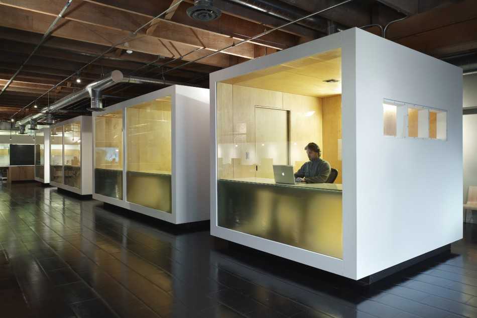 Руководительский кабинет под потолком, с полным обзором рабочего зала в офисе хард- и софтверного разработчика — компании, выпускающей разнообразную технику корпоративного назначения