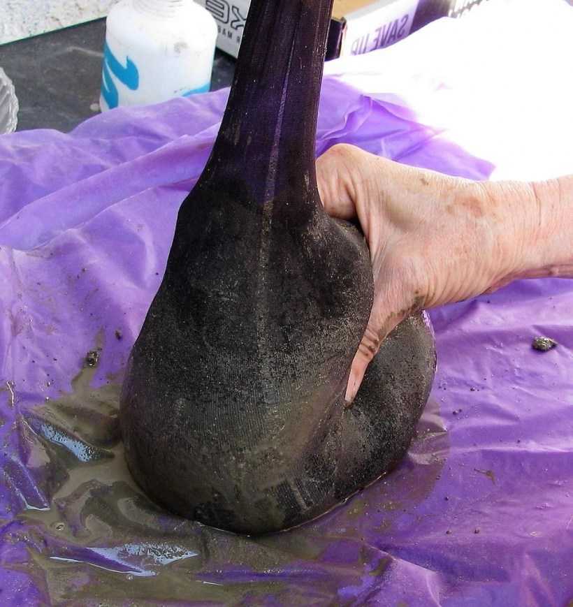 Приготовление рабочего раствора. Для этого в ёмкость выкладывают сухой гипс и добавляют к нему воду, столярный клей и смолу, предварительно растопленную в горячей ванночке. После тщательного перемешивания в массу вливаются пигменты или акриловые красители и снова размешиваются до образования прожилок.