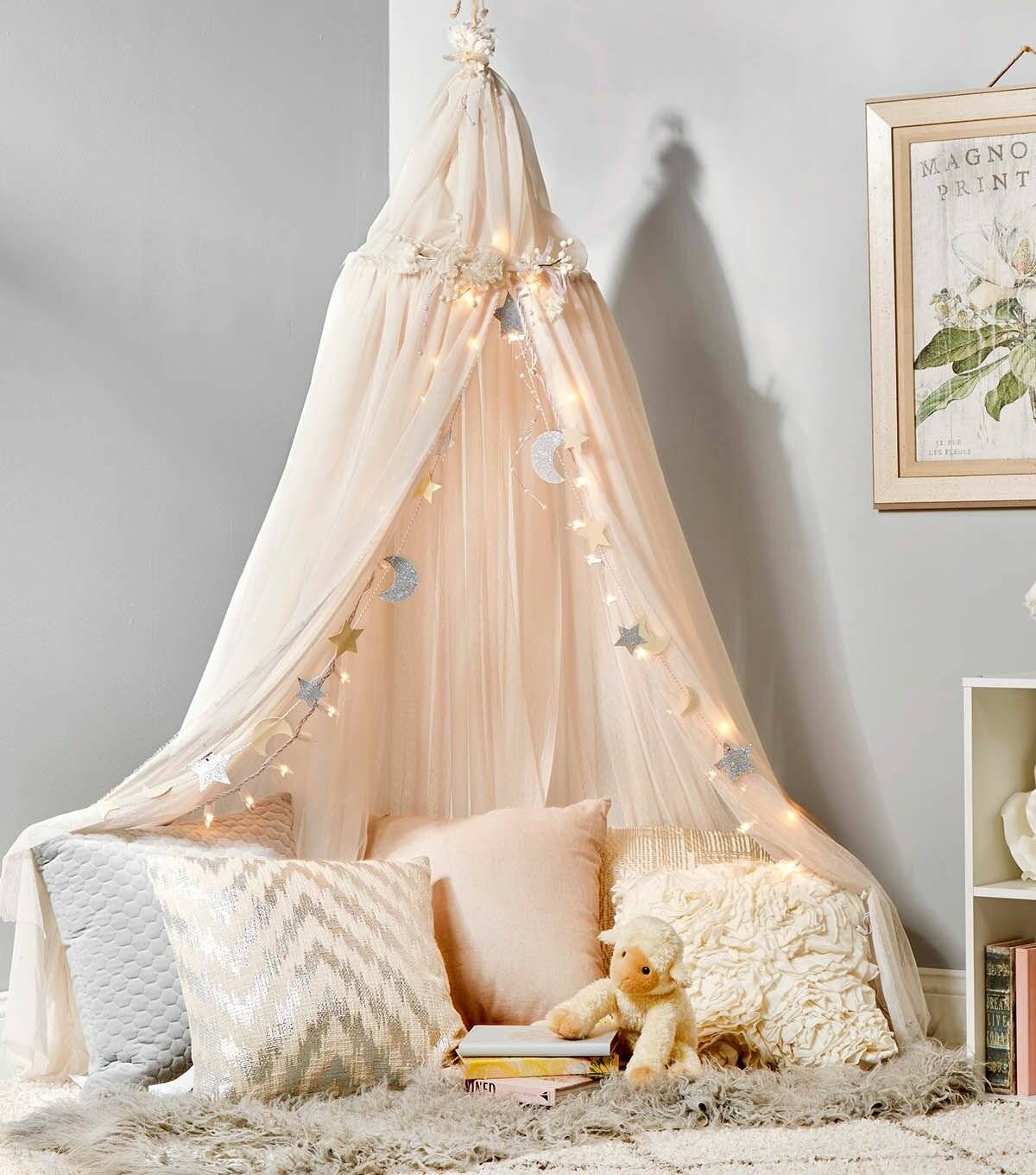 Балдахин – одно из наиболее популярных украшений для кроватей в детских комнатах для девочек. Он красивый, а сделать его очень просто. Длина ткани подбирается в зависимости от типа крепления: