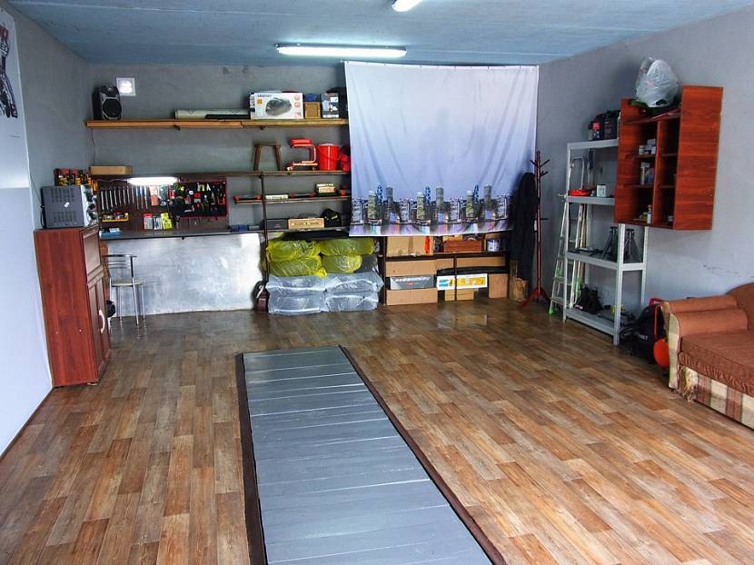 Достаточно развесить шторы на полочках. Лишь немногим приходит в голову обустроить комнату такой скромной деталью, однако рассматривать комплектующие и разнообразные инструменты не желаете. Шторы способны создать изящный эстетический вид для всей комнаты. Отдых тут будет полноценным. Полноценный отдых предполагает наличие небольшого по размерами стола со стульями. Не всегда можно пойти домой, чтобы что-то поесть, а гараж то самое место, где можно собраться с друзьями за столом и выпить пиво. Гараж обустраиваем с учетом расстояния от напольного покрытия до стеллажей. Таким образом, вы сможете без труда помыть пол, так как хочется свой отдых проводить в чистоте. Поэтому рука тянется, сделать стеллажи на расстоянии около 18 см. Стяжка под углом и стоки для выхода воды из помещения. Сегодня гараж с таким обустройством имеется не у каждого