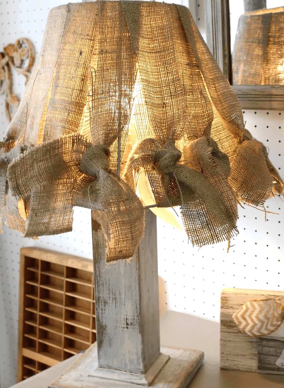 Очень интересно, например, на кухне, может смотреться абажур, сшитый из мешковины. Эта ткань хорошо пропускает свет. Такой абажур можно украсить какими-нибудь деревянными деталями, например, прищепками или деревянными бусинками и пуговицами.