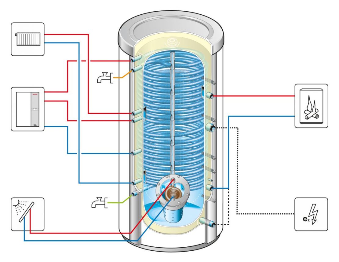 Типы отопительных систем с теплоаккумулятором и разным количеством змеевиков