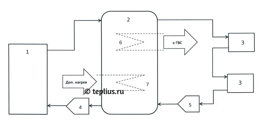 Система может работать и в обратном порядке, через змеевик может бить запитана система отопления или ГВС.