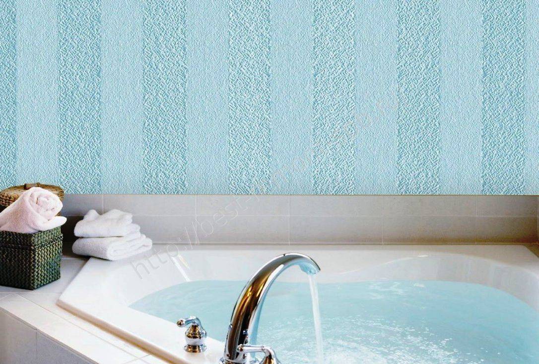 Важно знать, что подобный тип обоев все же может пропускать часть влаги. Следует отделывать лишь дальние, от ванны или душа, стены
