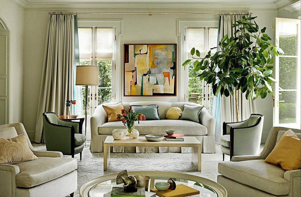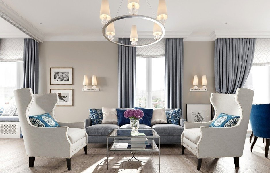 Важна парность меблировки, симметрия, светлая отделка, белый камин, просторные кресла, классические портьеры.