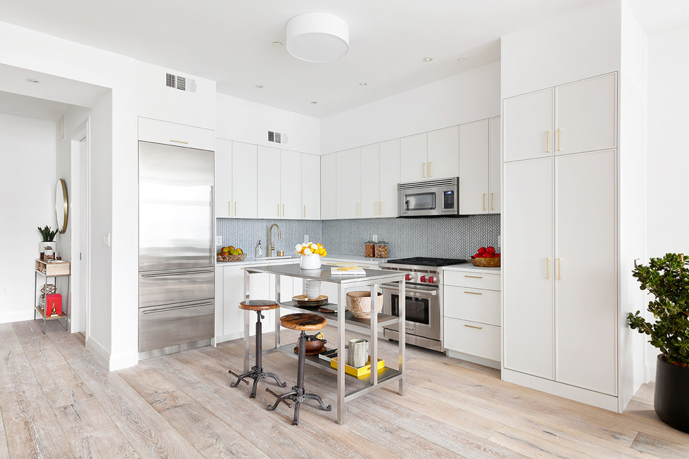 По правилам американского стиля в интерьере кухни обязательно должна быть барная стойка. Так как кухни обычно просторные, то для них выбирается крупногабаритная мебель и бытовая техника. Стол обычно небольшого размера, так как он не используются для семейных трапез.