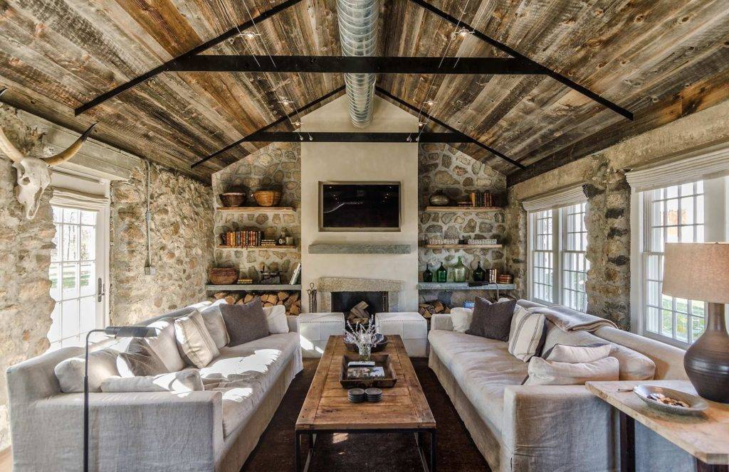 Направление зародилось в богатых загородных домах, а вовсе не в глубинке, как многие считают. Дешевизна и аскетизм не являются определяющими чертами данного стиля. Деревянная отделка стен, пола, открытые балки на потолке, грубая мебель из необработанной древесины – характерные черты кантри. Неотъемлемый атрибут гостиной – камин перед зоной для отдыха с комфортной мягкой мебелью, обитой кожей или грубыми тканями с натуральным составом. Стиль чрезвычайно приближен к природе, поскольку основывается на использовании экологичных материалов и естественной цветовой гаммы.