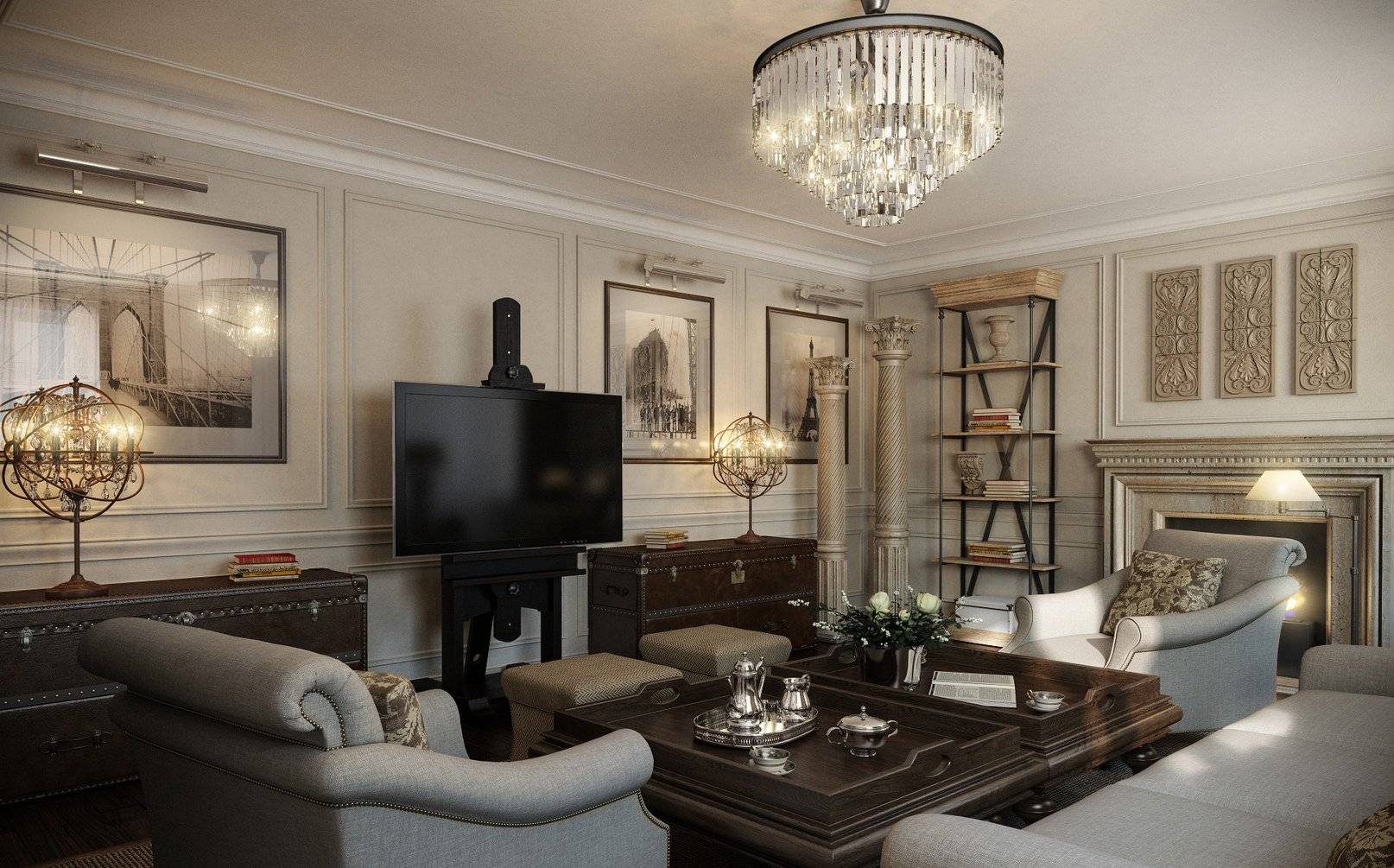 Необходимо так обустроить гостиную, чтобы она оставалась комфортной, светлой и просторной. Главная роль отводится массивной мягкой мебели, которую лучше расположить в центральной части комнаты около камина или большой телевизионной панели. Кресла и диван концентрируются вокруг миниатюрного журнального столика. Между предметами выдерживается достаточно серьезная дистанция. Вместо мягких кресел, из гарнитура могут использоваться плетеные аналоги. Технические устройства, библиотеку, декоративные элементы располагают в специально оборудованных нишах. Горизонтальные поверхности, как правило, свободны от декора и гаджетов. В интерьере недопустимо использование крупногабаритных шкафов или стеллажей.