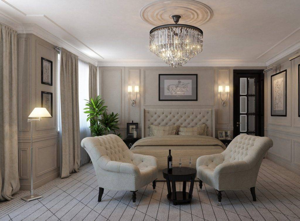 Для спальной зоны выбирают материалы натурального происхождения. Кровать классического стиля располагают возле стены, возле нее ставят тумбочки и вместительный комод.