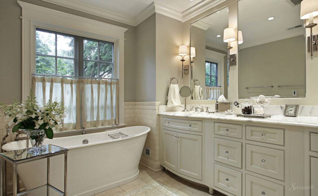 Единственной, довольно необычной и роскошной деталью американской ванной комнаты является окно, при этом, не маленькое слуховое или вентиляционное, а большое, которое завешивается ролетами или жалюзи.