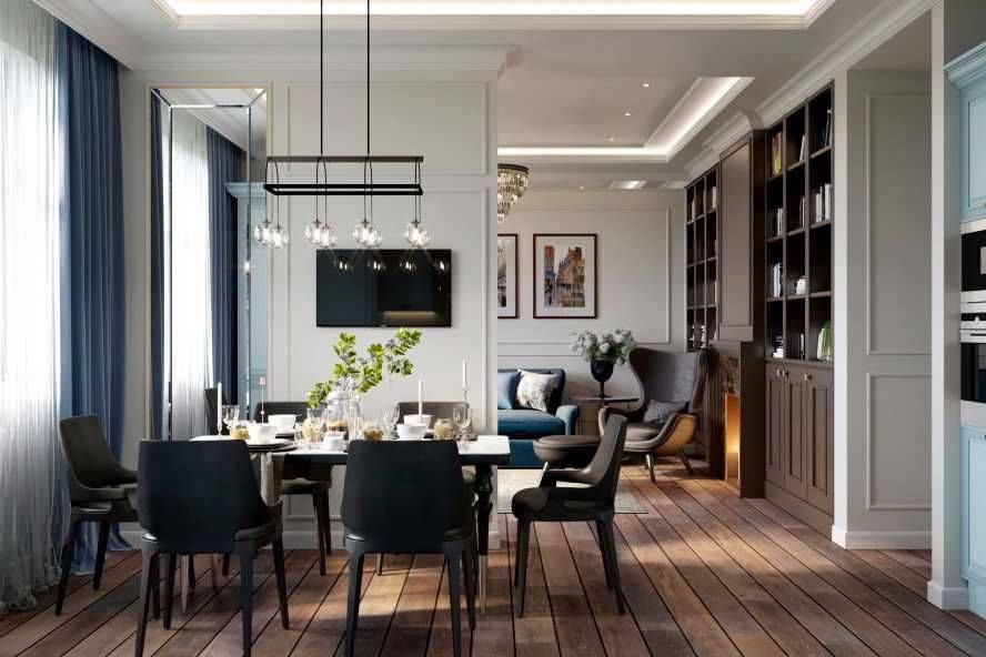 Между кухней и гостиной выстроена прямоугольная современная арка с большим проёмом.