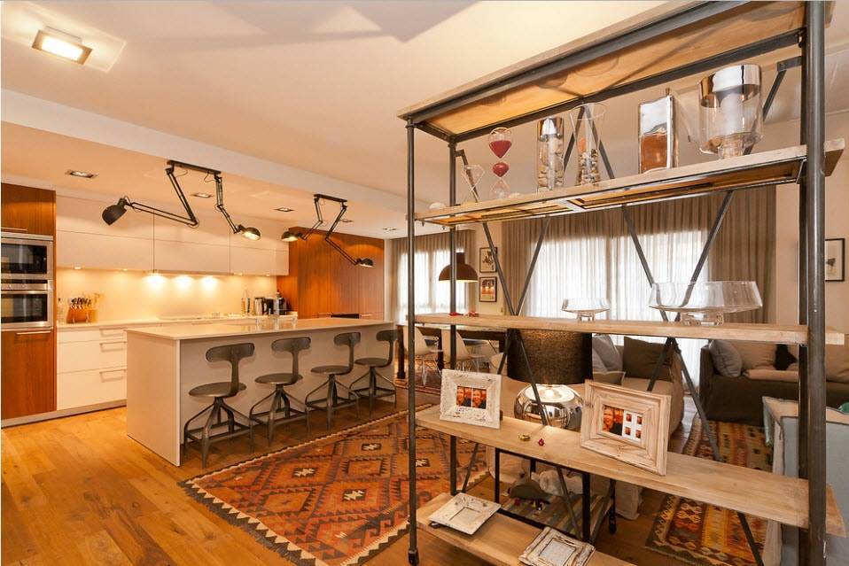 Перед нами отличный пример перегородки, которая не только разделяет кухню и гостиную, но и используется, как стена под телевизор, причём с двух сторон. Также она образует в кухонной зоне угол для обеденного стола. Так как комната не очень большая дизайнер использовал зеркала. Отражающие поверхности делают углы конструкции не столь заметными.