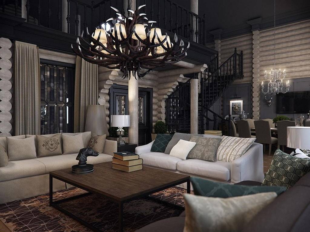 Какой бы вариант не выбрал владелец коттеджа, гостиную комнату лучше делать в едином для обоих направлений стиле. Это обязательно должна быть самая просторная комната с высокими стенами.