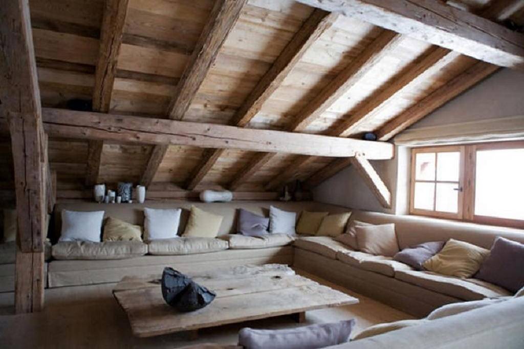 Потолки высокие, деревянные. Потолочные балки чудесно передают атмосферу альпийского дома, хотя в современном варианте являются частью декора (в мансарде открытые балки — часть стропильной системы крыши).