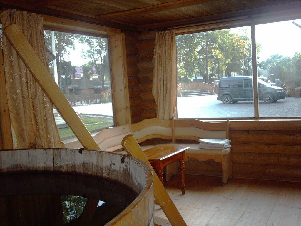 Внутри ёмкости имеются два деления. Одно из них предназначено для водных процедур, в другом располагается устройство, отвечающее за подогрев воды. Оно может быть установлено и снаружи. Огромный сосуд для купания, или купель, оборудован скамейкой. От её размера зависит то, сколько людей поместится.