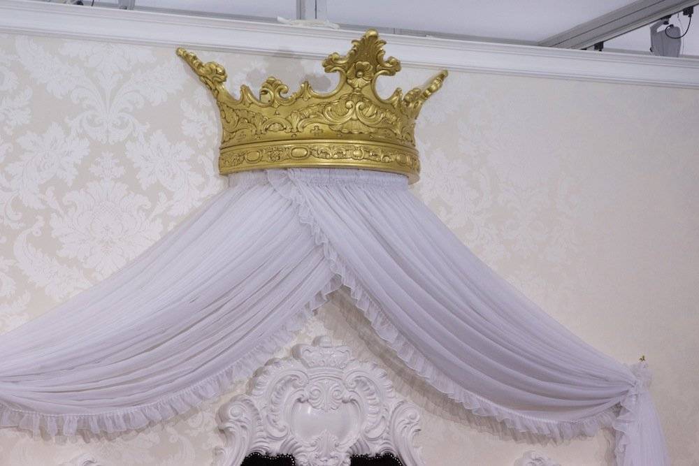 Крепление в виде «короны» имеет роскошный вид. Эта разновидность используется в основном для декоративных целей, подходит для разных стилей, украшает изголовье кровати легкими тканями. Навес можно использовать даже в маленькой комнате, так как он занимает мало места, визуально не уменьшает ее, может крепиться временно.