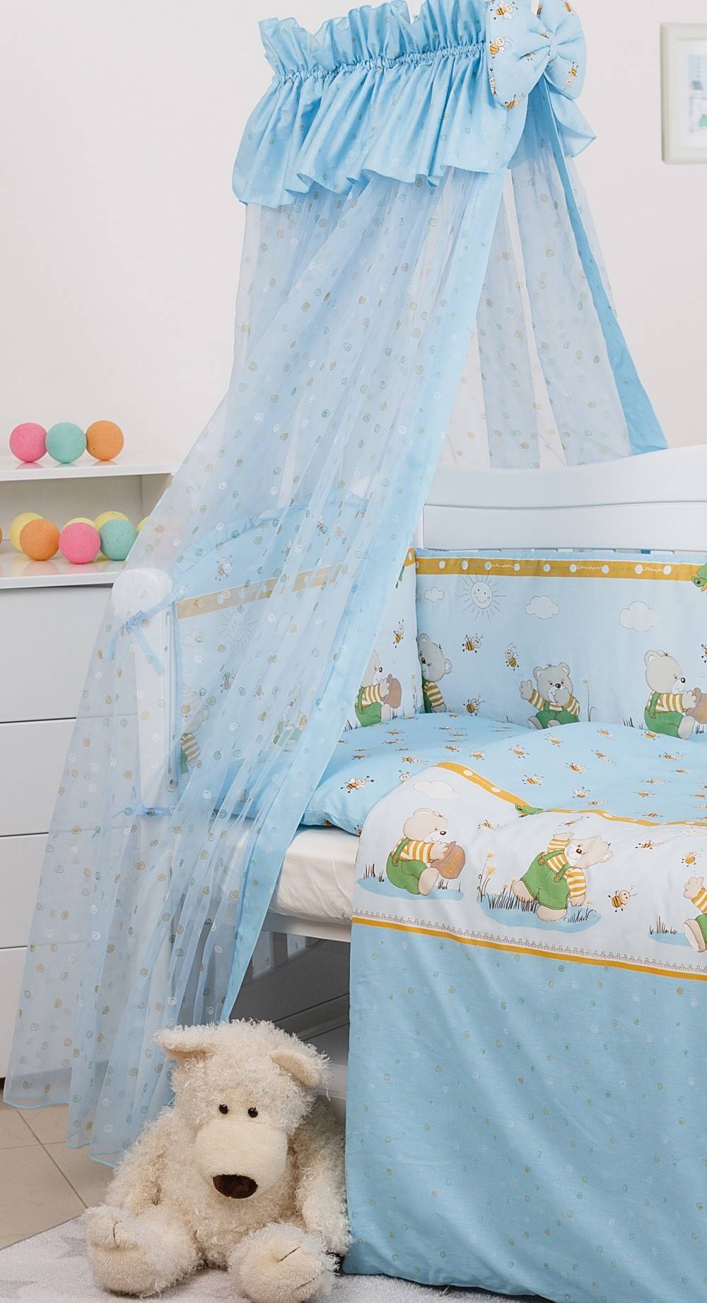 После подготовительных моментов отправляйтесь в магазин тканей и покупайте два вида: тонкую и более плотную, обычно берут не менее 4,5 метра для стандартной прямоугольной кроватки. Не забудьте приобрести тесьму для сборки, кнопки, пару пуговиц на низкой ножке или крючки. Для декора можно купить кружево.
