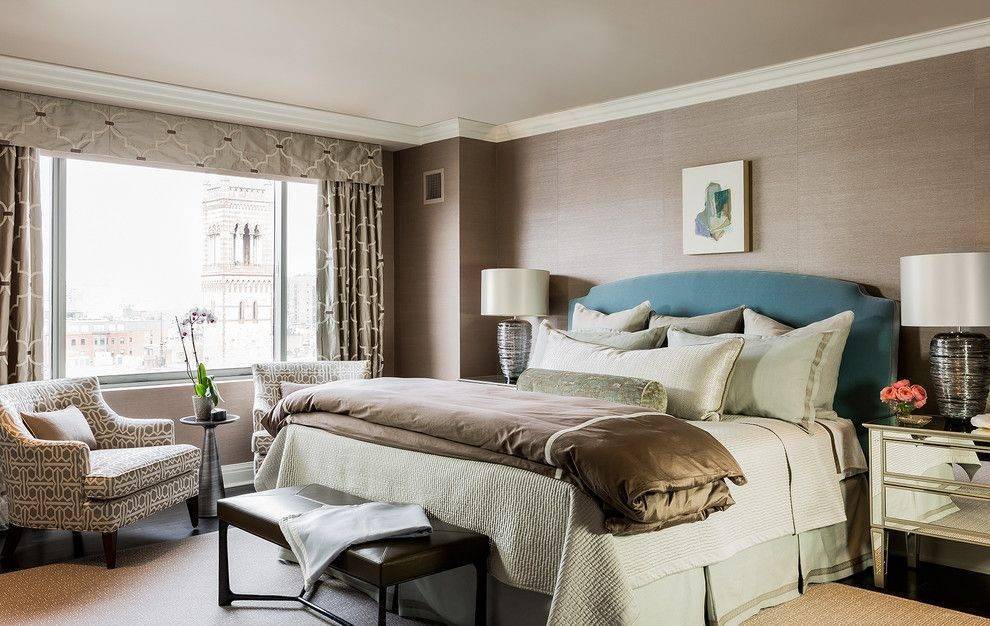 На фото городская квартира в морском стиле. Дизайн освежают предметы мебели и декора бирюзового цвета.