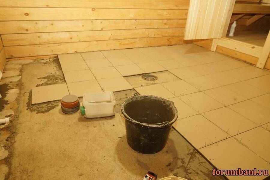 Работы возобновляются после снятия опалубки. Снимаем плодородный слой почвы и монтируем канализационный трап с приёмником стоков – пластиковую или металлическую трубу. Труба должна иметь уклон для естественного слива воды. Основание бани засыпаем 10-сантиметровым слоем песка, сверху – слоем гравия или керамзита толщиной 15 см. Грунт тщательно уплотняем. Затем укладываем решётку из металла для армирования. Делаем стяжку: подготовленную поверхность заливаем бетоном толщиной 15 см.