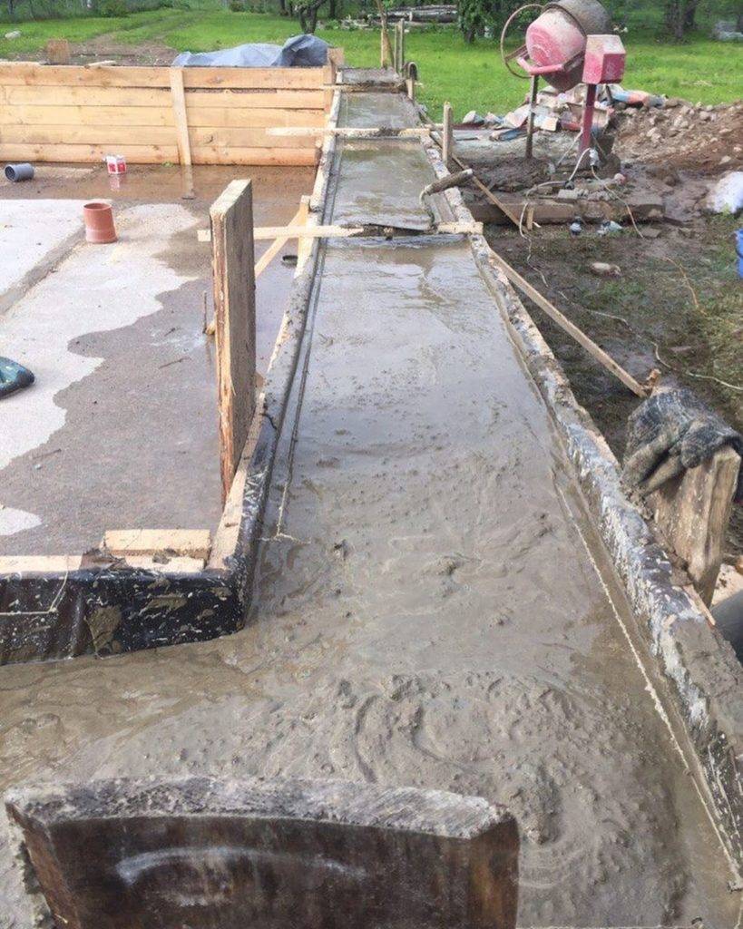 - Сколотить щиты опалубки, закрепить их вдоль всех траншей с двух сторон. Высота опалубки — 40 см.