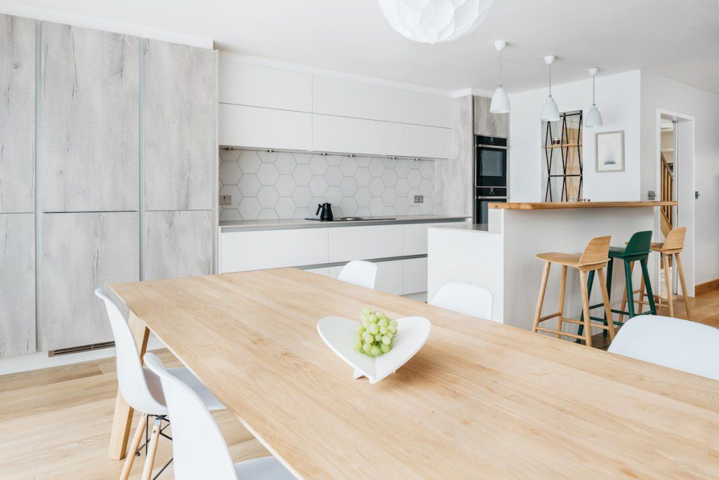Комбинация белого цвета и дерева натурального оттенка очень приятна глазу, а еще она универсальна, а главное — просто создана для реальной жизни. Неспроста белая кухня с деревянной столешницей и полом является одной из самых популярных во всем мире.