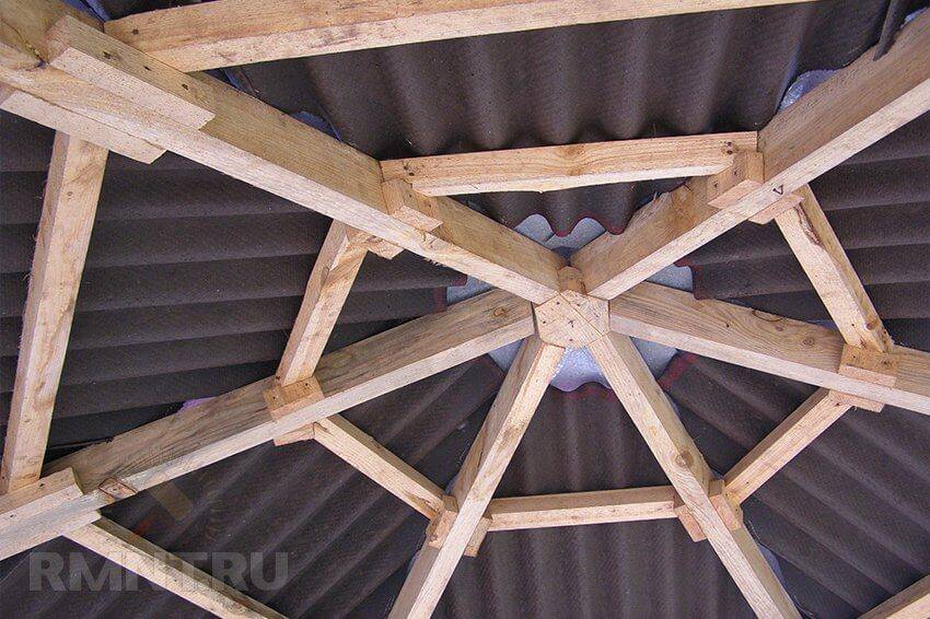 Наберитесь сил, попейте водички. Вам предстоит водрузить собранную на земле деревянную конструкцию наверх беседки. Верхушка должна опереться на брусок. Установите конструкцию строго по центру, проверьте отвесом градус вертикальности бруска. Если все готово и стоит нормально, закрепите концы стропил к пробкам, которые вбивали. Снимите подпорку и можете монтировать любой выбранный материал.
