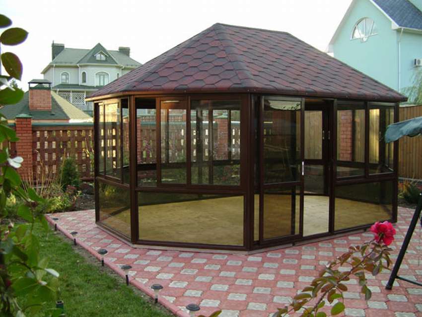 - Закрытые – постройки для времяпрепровождения в холодное время года. Между опорами половину пространства зашивают отделочным материалом, а свободную часть остекляют.