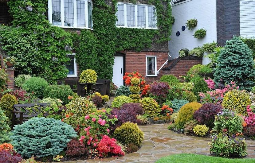 Высота растений должна уменьшаться по мере приближения к дому. Самые высокие деревья следует размещать в глубине участка, а возле строения можно посадить цветы и кустарники.