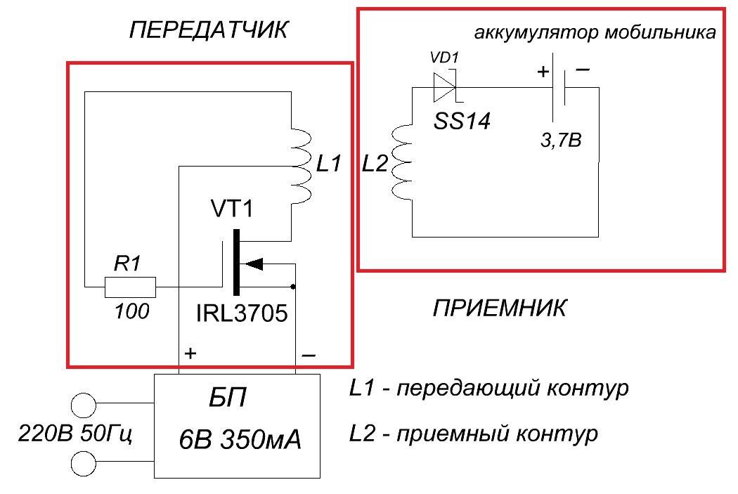 - Само устройство собирается из заранее подготовленных деталей, ориентируясь на приведённую ниже схему. Применение SMD позволяет минимизировать пространство, отводимое под катушку, следовательно, конструкция корпуса телефона остаётся без изменений.