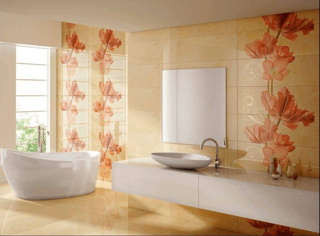 Красиво смотрится бежевая плитка для ванной в сочетании с узорчатыми вставками в других цветах
